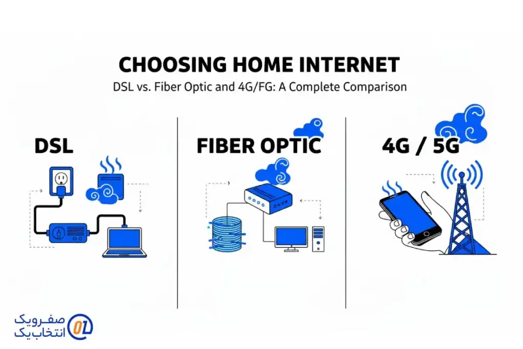 انتخاب بهترین سرویس اینترنت برای منزل، تصمیمی کلیدی است که بر تمام فعالیت های آنلاین شما از تماشای فیلم و بازی های آنلاین گرفته تا کار از خانه و آموزش تاثیر می گذارد. در دنیای امروز، تنوع گزینه های اینترنت خانگی بیشتر از هر زمان دیگری است. سه مورد از رایج ترین و مهم ترین تکنولوژی هایی که مصرف کنندگان با آن مواجه هستند، DSL (خط اشتراک دیجیتال)، فیبر نوری و اینترنت بی سیم نسل چهارم و پنجم (4G/5G) هستند. در این مقاله، به مقایسه کامل این سه فناوری خواهیم پرداخت تا بتوانید هوشمندانه ترین انتخاب را برای نیازهای خاص خود انجام دهید.